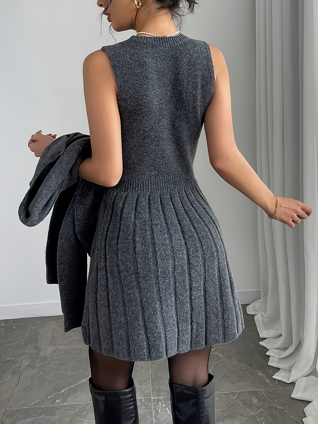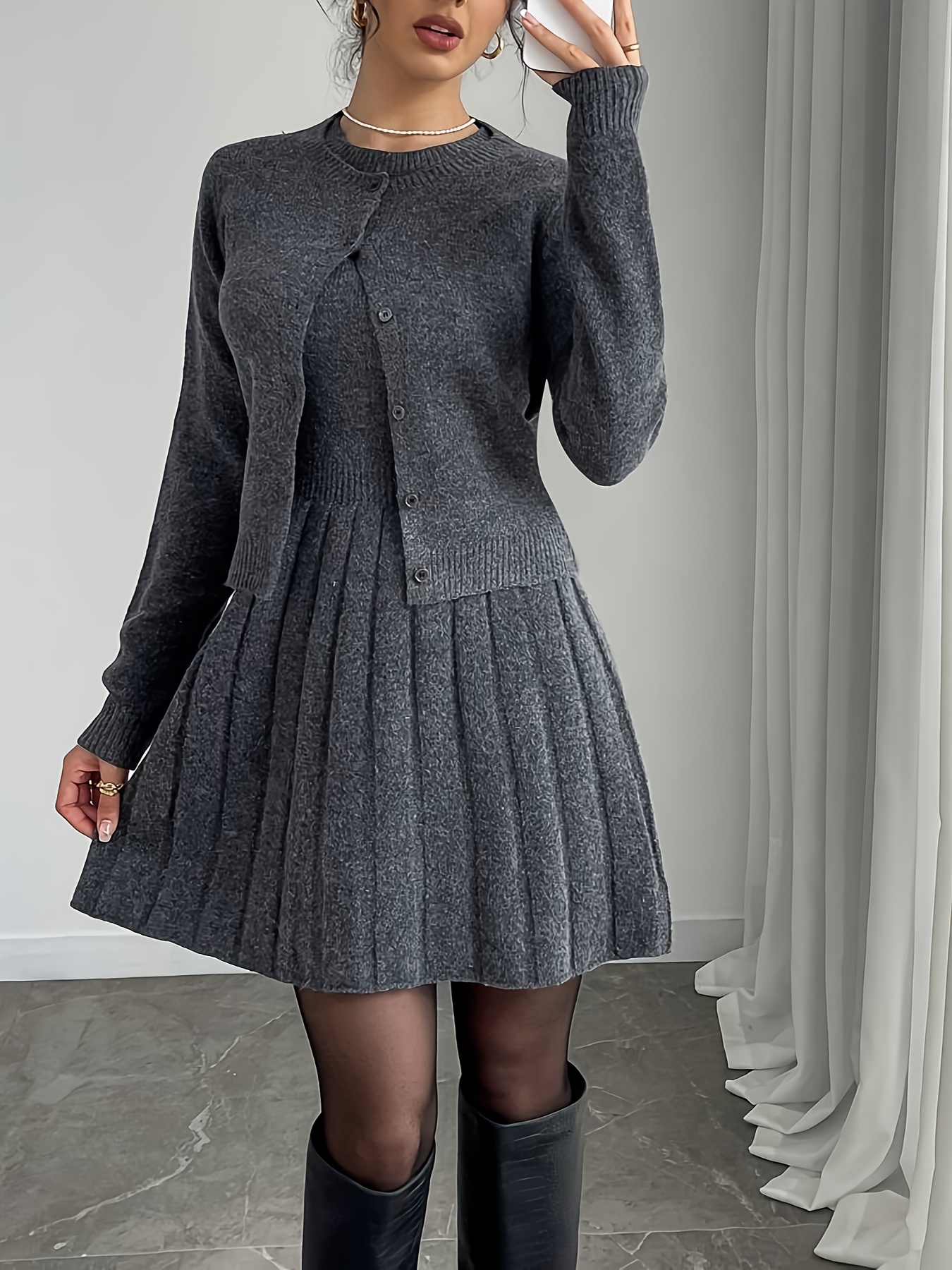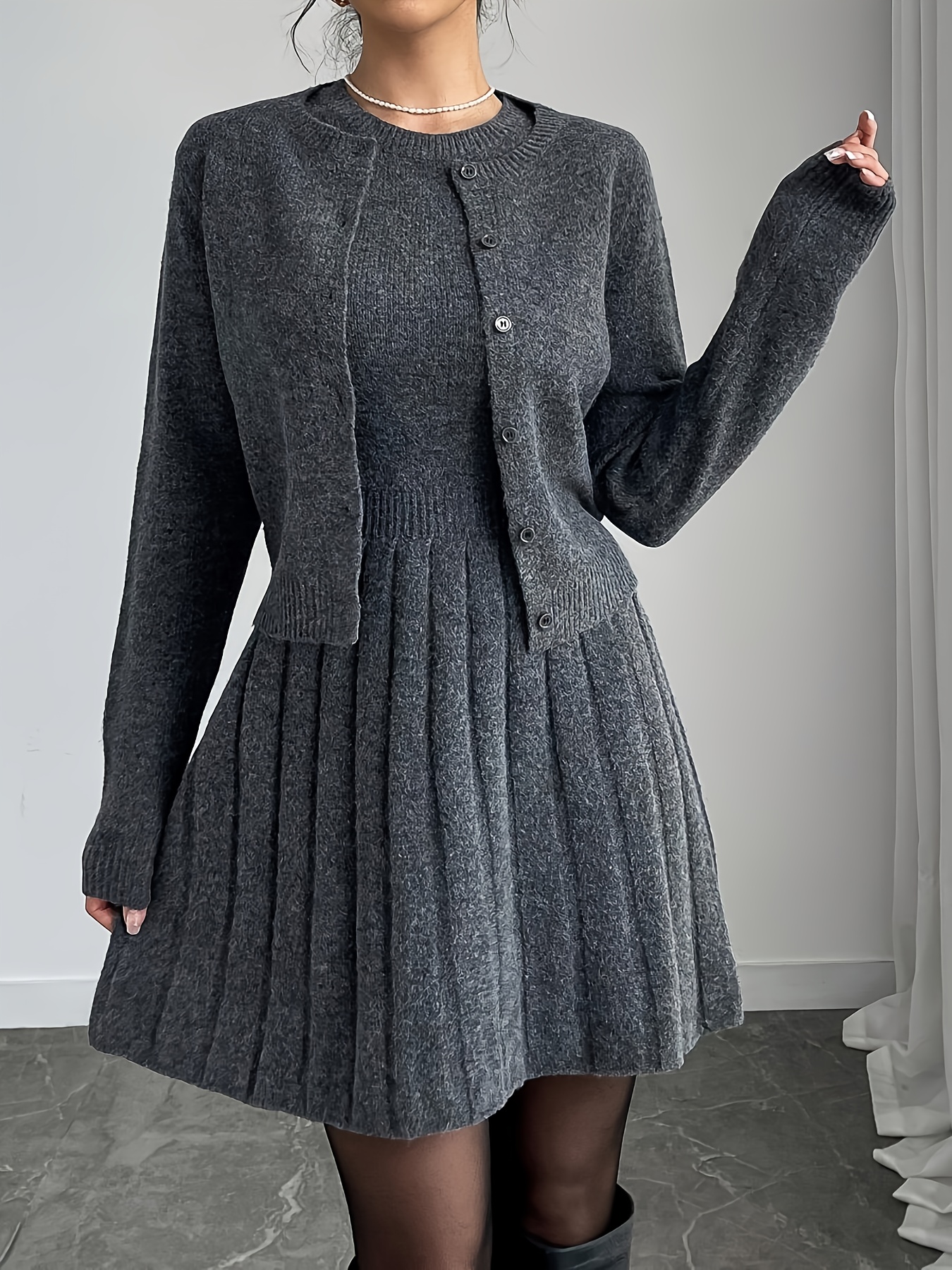 2pcs Elegant Set: Gray Button-Front Long-Sleeve Sweater and Round-Neck Pleated Sleeveless Dress