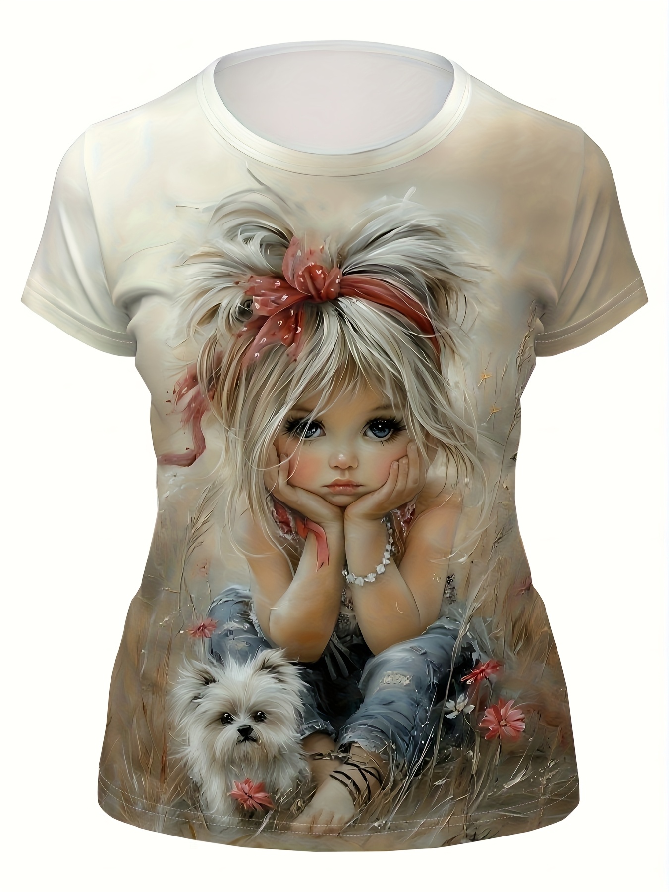 Plus Size Women's Round Neck Short Sleeve T-Shirt with Cute Little and White Dog Outdoor Pattern Print