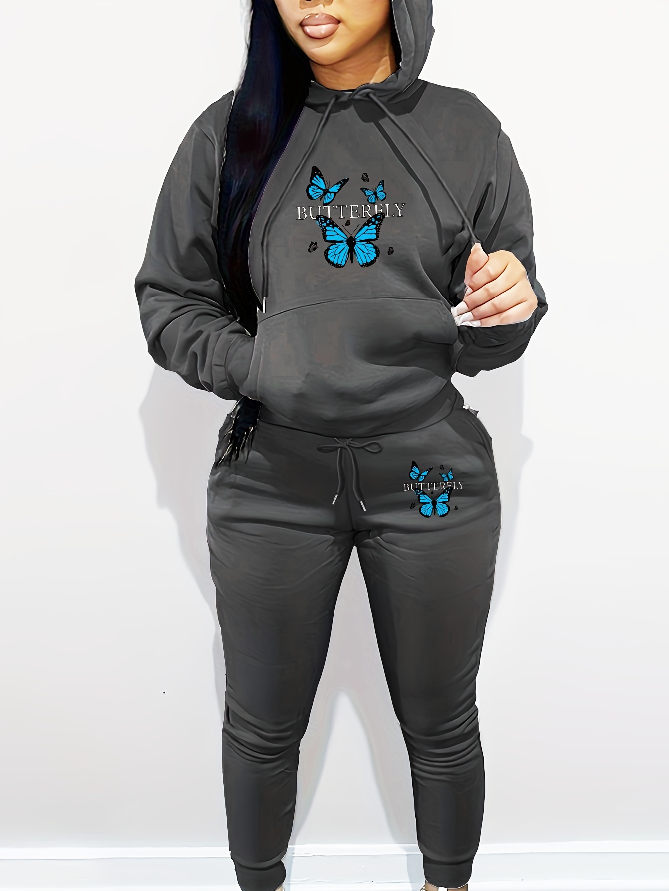 Women's Casual Butterfly Pattern Knit Polyester Two-Piece Set with Hooded Long Sleeve Hoodie and Regular Fit Pants with Pockets