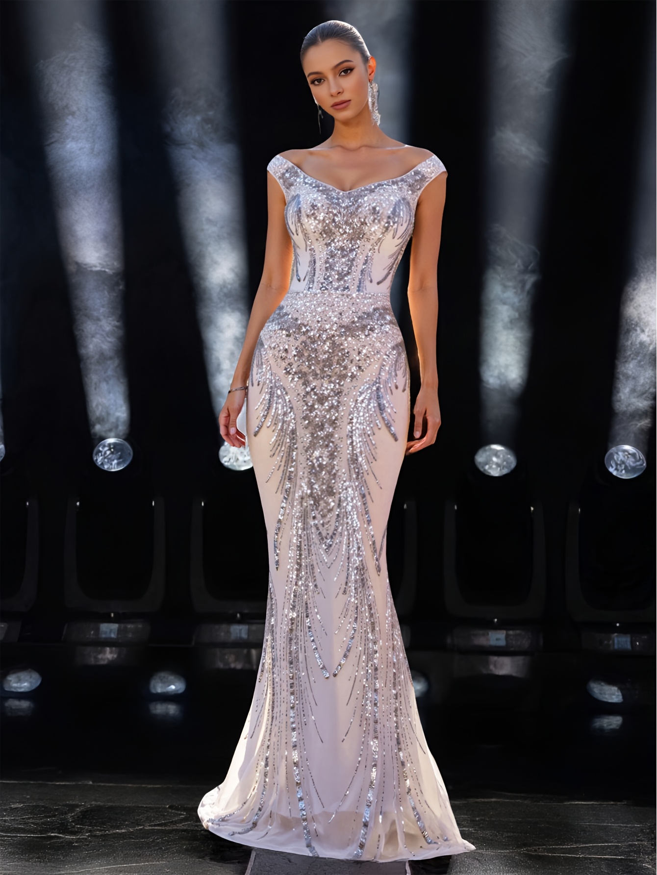 Elegant Off-Shoulder Sequin Mermaid Gown for Women - Luxurious V-Neck, Fitted Waist, Flared Hem, Sparkling Embellishments, Perfect for Parties, Weddings, and Formal Events, Formal Evening Gown