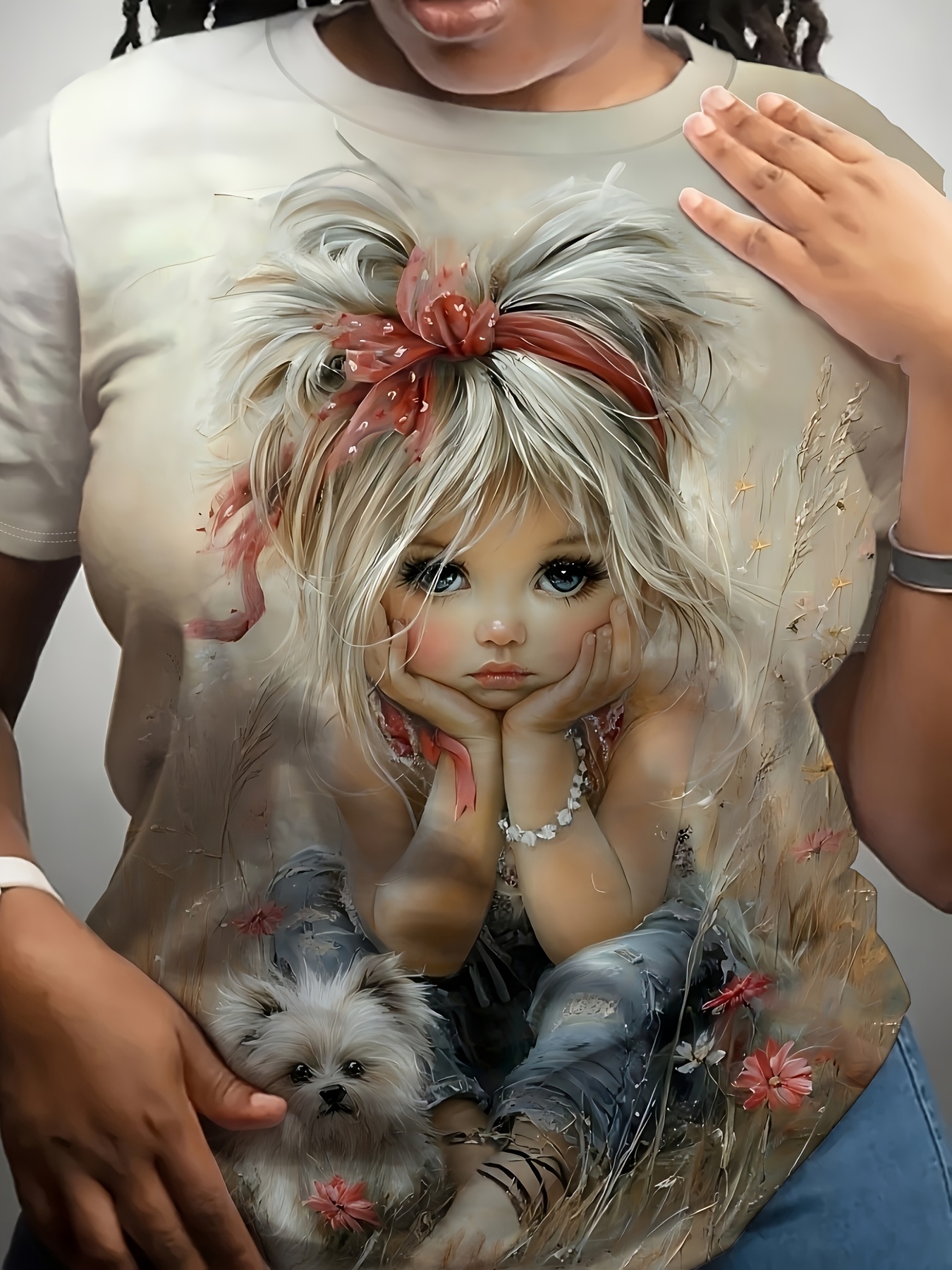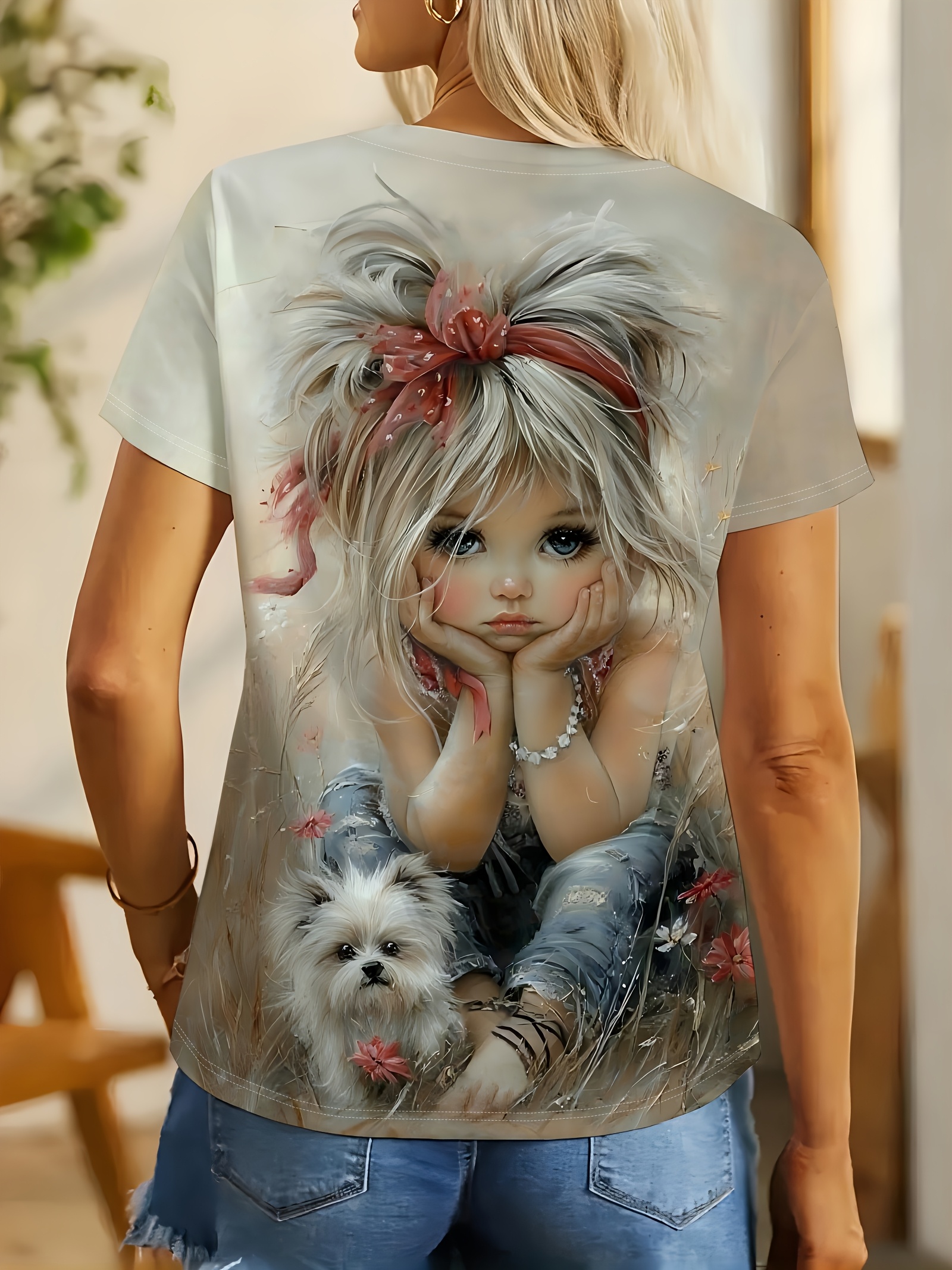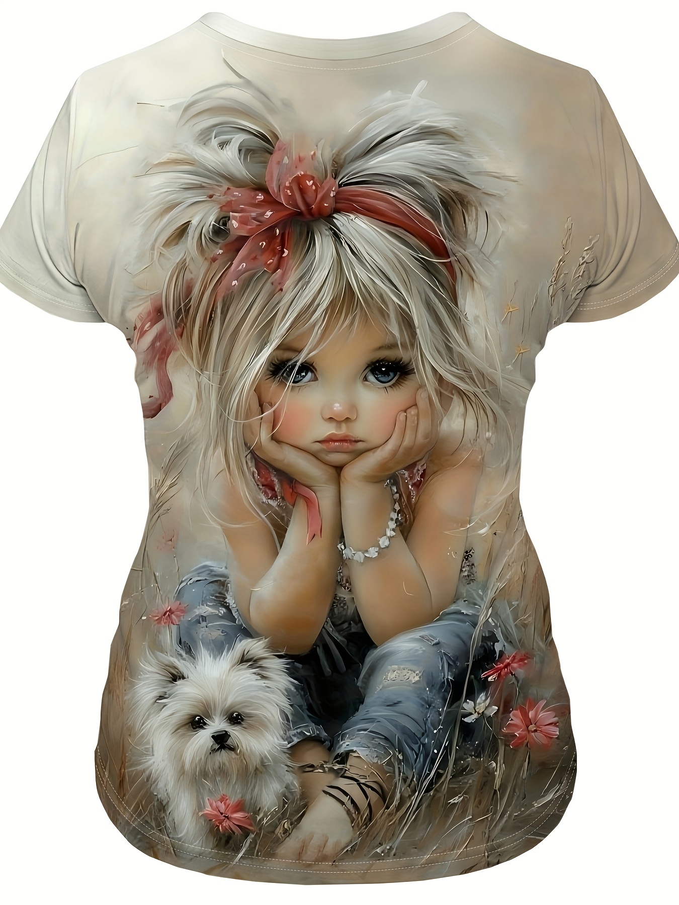 Plus Size Women's Round Neck Short Sleeve T-Shirt with Cute Little and White Dog Outdoor Pattern Print